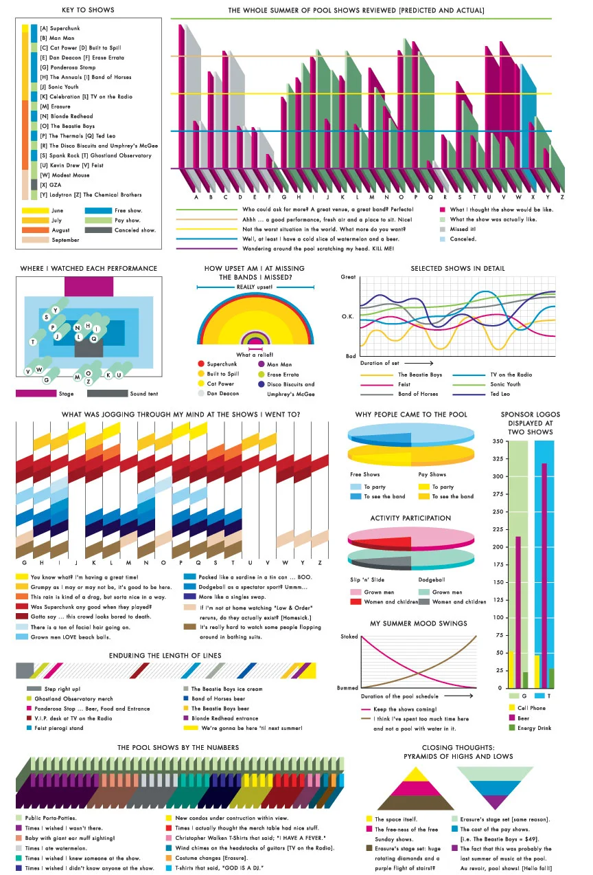 Another page of quirky charts from Andrew Kuo that I came across from October 2007. These try to represent information about the 2007 summer's series of concerts at Brooklyn's McCarren pool.