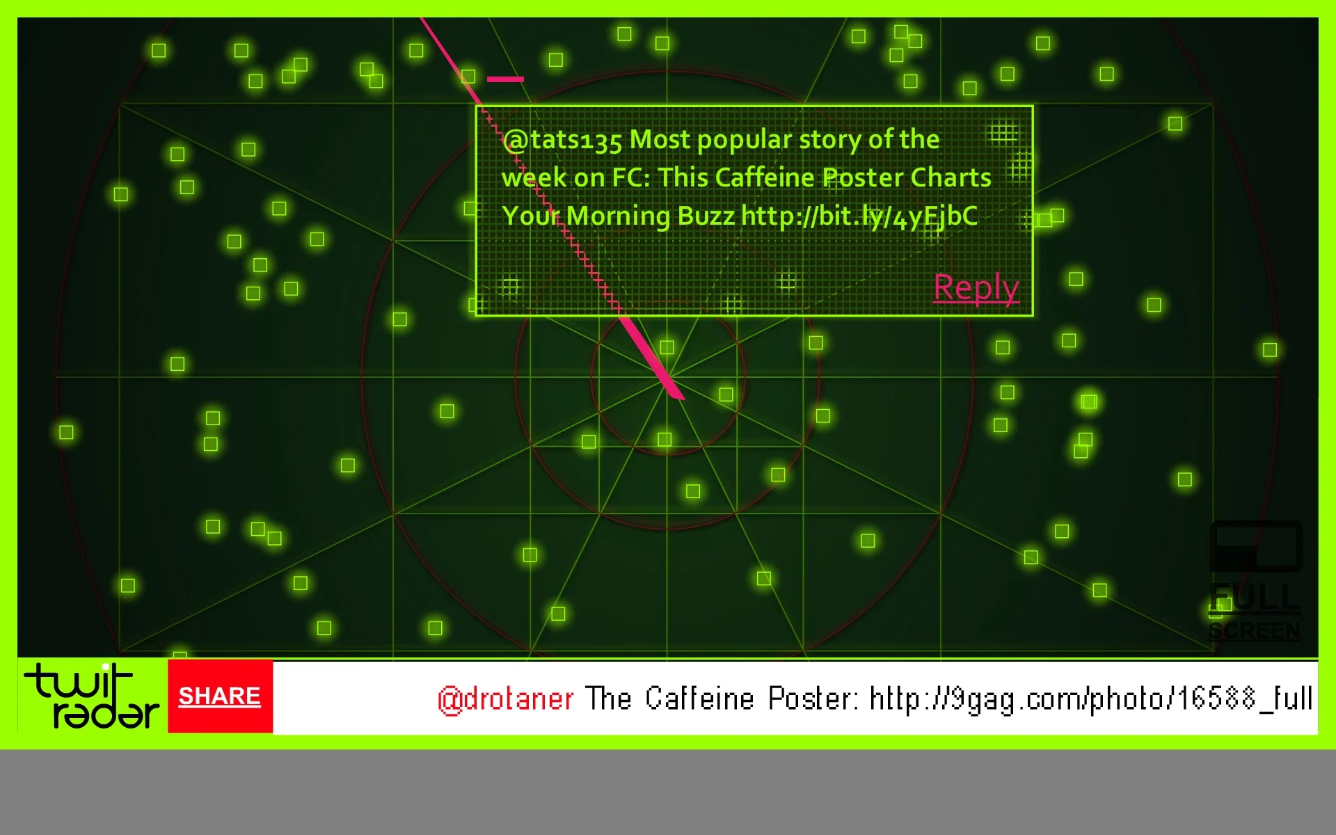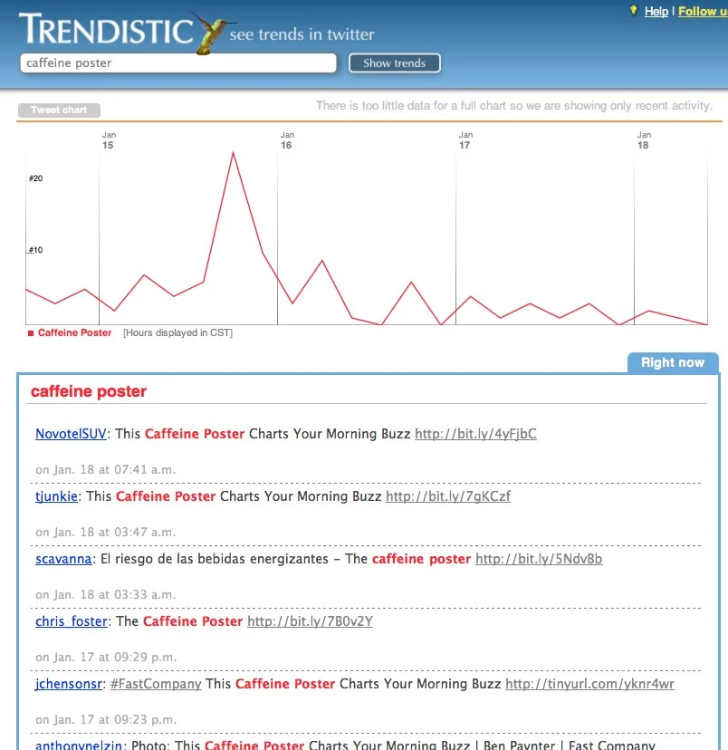 The Caffeine Poster got a huge amount of traffic, specifically on Twitter, so I thought this would be a good chance to share a collection of the available, interactive twitter visualizations. Although there are many visuals that show a Twitter user’s network of connections, these are visualizations that show conversations based on the search topic “caffeine poster” on Twitter.