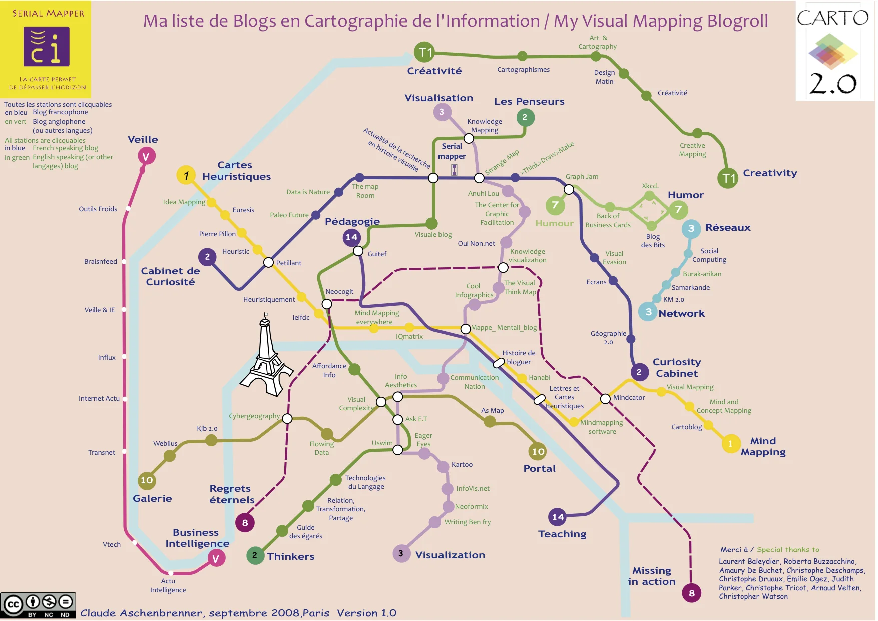 Created by Claude Aschenbrenner (SerialMapper.com), the graphic is modeled onto the Paris subway system. Because of that (and that Claude speaks French), each line is identified in French on the left end and English on the right end. Websites that are in French are also noted in blue text.