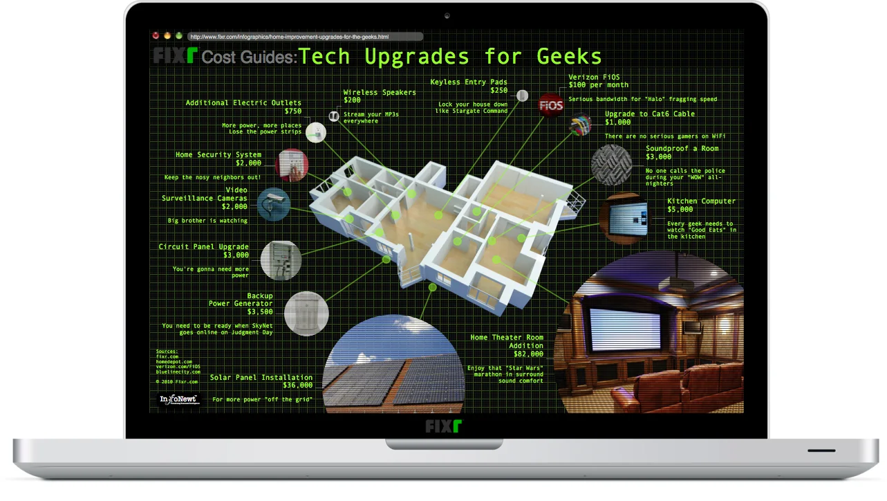 A new infographic for Fixr.com designed by InfoNewt (my company), the Tech Upgrades for Geeks looks at a handful of home improvements that anyone can do to their house to upgrade their technology quotient. Upgrades range from small ($100) to large ($82,000), and the images surrounding the floor plan are sized appropriately.