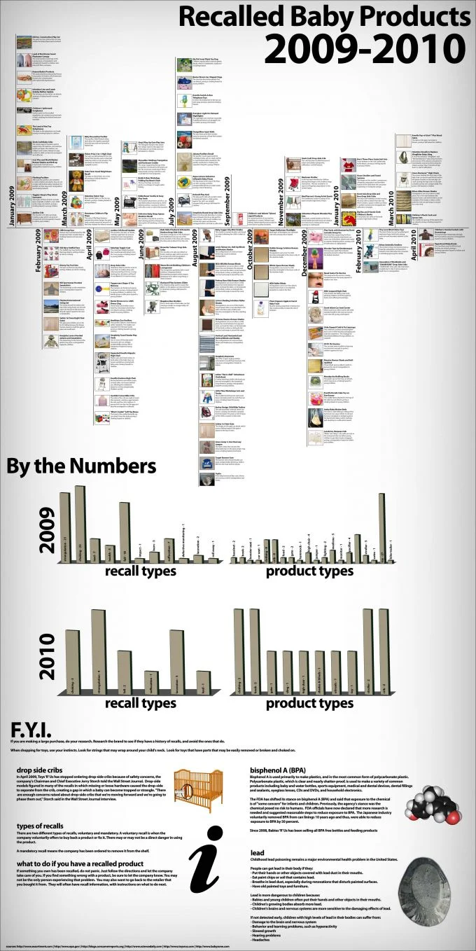 The team at HugaMonkey.com has created this neat timeline of Baby Product Recalls in 2009 and 2010. The timeline is the main feature, but they also broke down the recalls by injury and product type in the bar charts below.