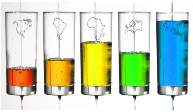 I love the cool infographic video from NPR. 7 Billion: How Did We Get So Big So Fast? is a video that uses colored liquids to visualize the population rates of the differen continents. High birth rates mean fast liquid pouring in, slower death rates slow down the liquid dripping out of the bottom.