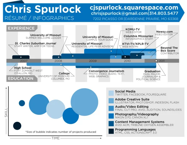 The Cinderella Story example is the Chris Spurlock resume shown below. The story is that Chris was a graduating Journalism major at Missouri School of Journalism in early 2011, and created his infographic resume because he wanted to pursue data journalism as a career. It was posted on the J-School blog, but quickly went viral on the Internet. As a result, he was hired as an Infographic Design Editor for the Huffington Post!