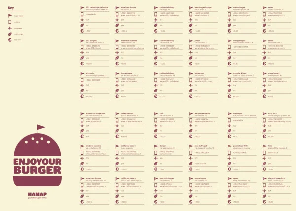 The map is the main focal point of this printed design, but the back side includes all of the details about each restaurant like the address, GPS coordinates, phone number, veggie burger availability and average price. The map locations are obviously visulized, but it would have been nice the the prices to be visualized as bars behind the numbers to easily compare prices at the different locations.