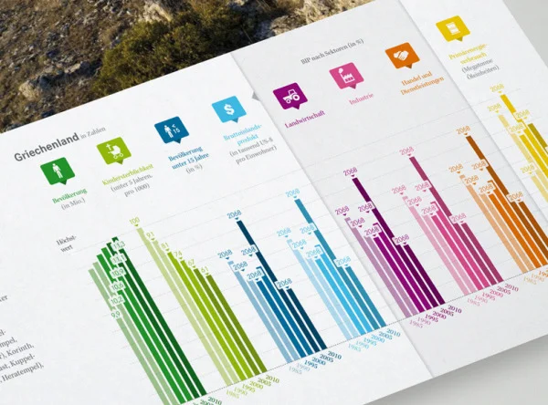 Series of info graphics for brockhaus, a large encyclopedia publisher from germany. The info graphics visualize several statistics and informations of topics like: the worlds highest mountains and their first ascent, the languages of the world, comets close to the earth, world oceans, ecology, media evolution and so on. One graphic shows the evolution of the world population from 1950 to 2050. Six transparent pages (one for each 20-year period) overlap each other.