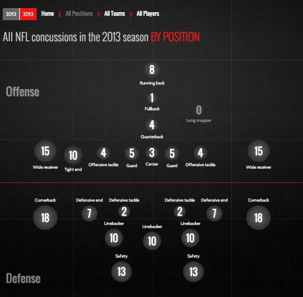 PBS Frontline has published the interactive data visualization, NFL Concussion Watch 2013 to summarize all of the player concussions reported in the NFL.