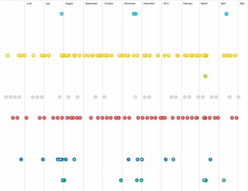Foursquare has release a new Foursquare Visualizer, that creates an interactive data visualization of your own activity for the last 12 months. I included the images from my own history.