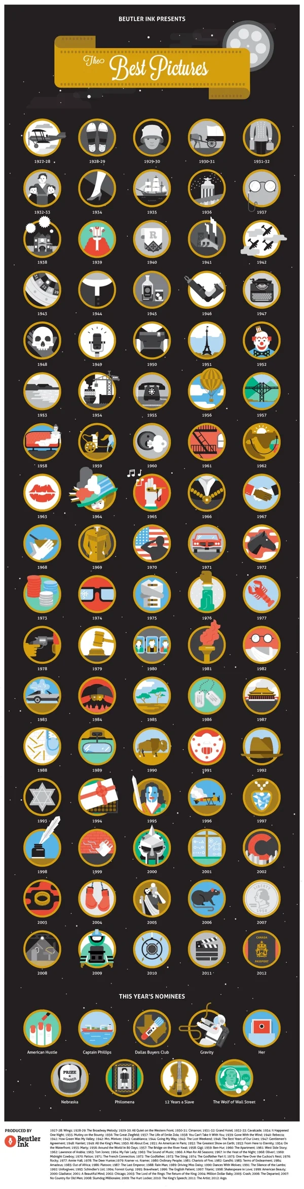 Beutler Ink celebrates the 2014 Oscars with a poster commemorating each of the past 85 Best Picture winners. See how many movies you can recognize from the icon alone.
