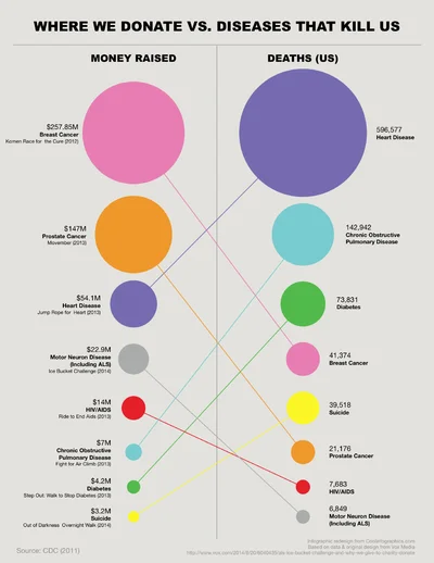 A second alternative would be to sort the lists to line up the related circles. This makes it much easier for the audience to see the direct comparisons between charitable contributions and death rates related to the same cause.