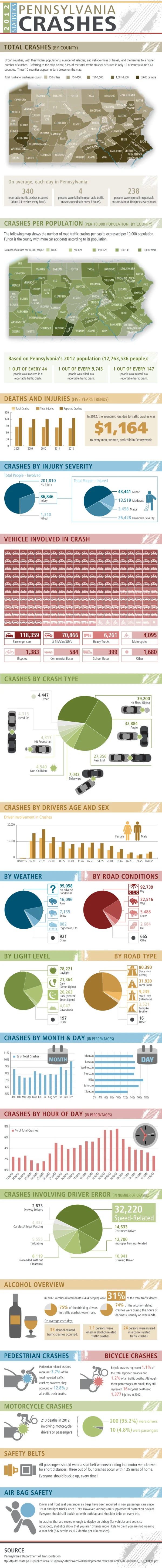This infographic is a very detailed look into the 2012 Statistics of Pennsylvania Crashes. Solnick & Levin, a law firm that works on cases of personal injury due to accidents, released the infographic to help potential clients understand where their case may fall in the overall state statistics.