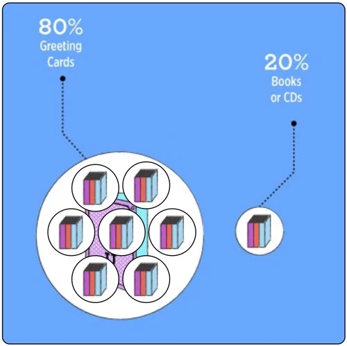 The circles is this design don't match any of the data. I'll demonstrate here. The total area of Greeting Cards at 80% should be exactly four times the area of the The Books circle at 20%. However, you can see here that I can easily fit seven of the Books circles in the Greeting Cards circle with much more room to spare!
