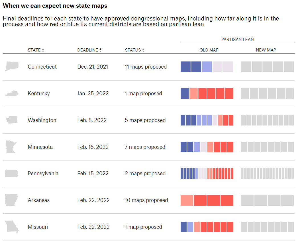 What Redistricting Looks Like in Every State is an updating tracker of proposed congressional maps. This is going to be a popular topic all year, and the interactive map by FiveThirtyEight shows how redistricting benefits Democrats or Republicans in the 2022 midterms and beyond. State and local governments are using information collected from the 2020 census report to redistrict each state. There are multiple states that have not been released yet however the graphic below shows the proposed dates for the next few updates.