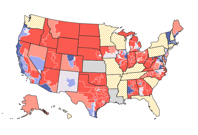 I prefer the grid visualization over the map. The map has the same problem as most election maps in that it’s visualizing the real estate area of the districts. This over-emphasizes the the rural areas with more land, but less people. I think the grid visualization does a better job of representing the count of districts that are changing or already have a clear majority.