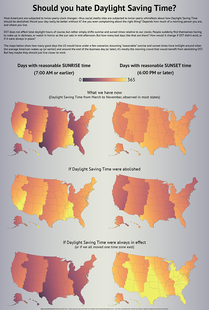 Back in 2015, Andy Woodruff took a deeper look into DST and mapped out how the time changes affect sunrise and sunset times across the United States. Depending on your preferences you could actually love it or hate it. Andy’s Should You Hate Daylight Savings Time infographic uses “reasonable” Sunrise time at 7:00 AM or earlier and “reasonable” sunset time of 6:00 PM or later. However, you can interact with his maps and create your own “reasonable” times to find out where you stand.