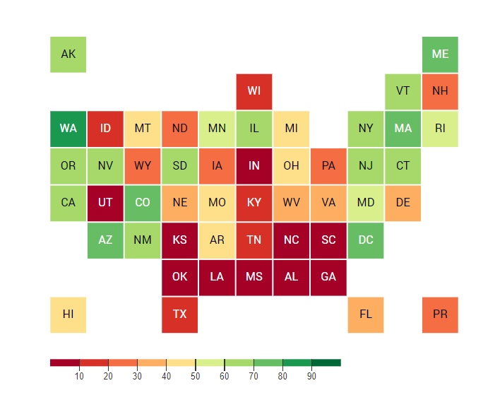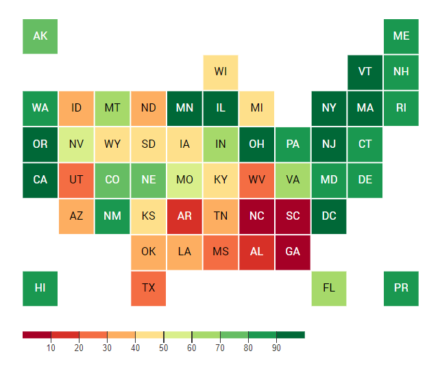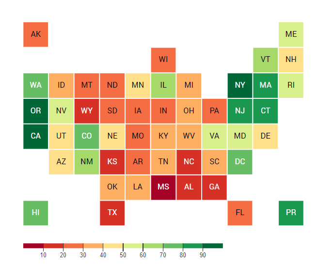 The Best and Worst States to Work in America infographic is the visualization of Oxfam America’s index. The index covers all 50 states, Puerto Rico, and the District of Columbia; grading these states based on the state’s policies as of July 2021 for wages (40% of score), worker protections (35% of score), and rights to organize (25% of score). How does your state rank?