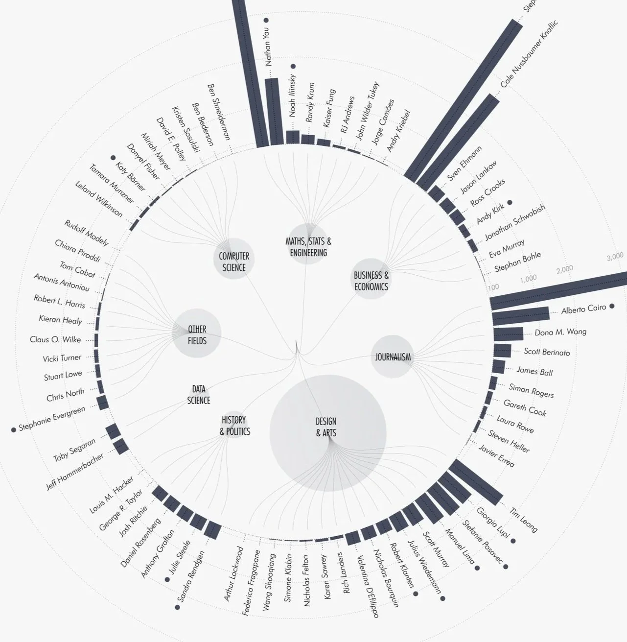 Evelina’s chart of The Authors of the Best Dataviz Books, combines the dataviz community’s published book authors to show which field everyone has come from. A good example of showing how diverse communities can utilize and benefit from data visualization. I made the chart under the Math, Stats, & Engineering section. Do you see other names you know?
