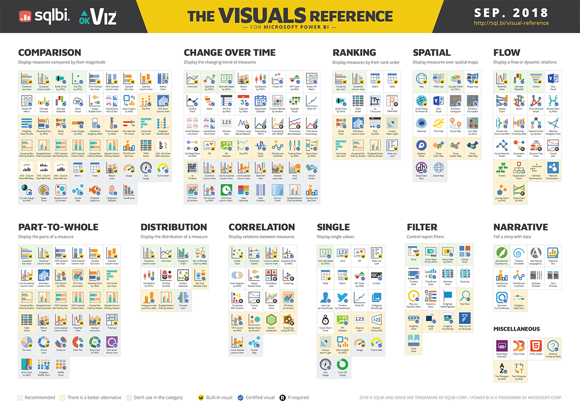 Even though it’s directed at users of Microsoft Power BI, this reference is a good classification for everyone. SQLBI analyzed all the 204 visuals available on Sep. 2018, assigned them to various categories, and printed the result in a downloadable PDF file. The legend allows you to identify built-in visuals, certified visuals, and visuals requiring an R environment. Furthermore, for some of the visuals we indicated better alternatives within the same category.