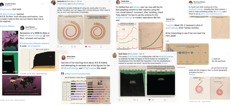 On February 2021, people on Twitter were challenged to re-create the historical data visualizations of W.E.B. Du Bois. The goal of the challenge was to celebrate his data visualization legacy by recreating the visualizations showcased at the 1900 Paris Exposition using modern tools. This is the story of that challenge: how it began, its process, results and lessons.